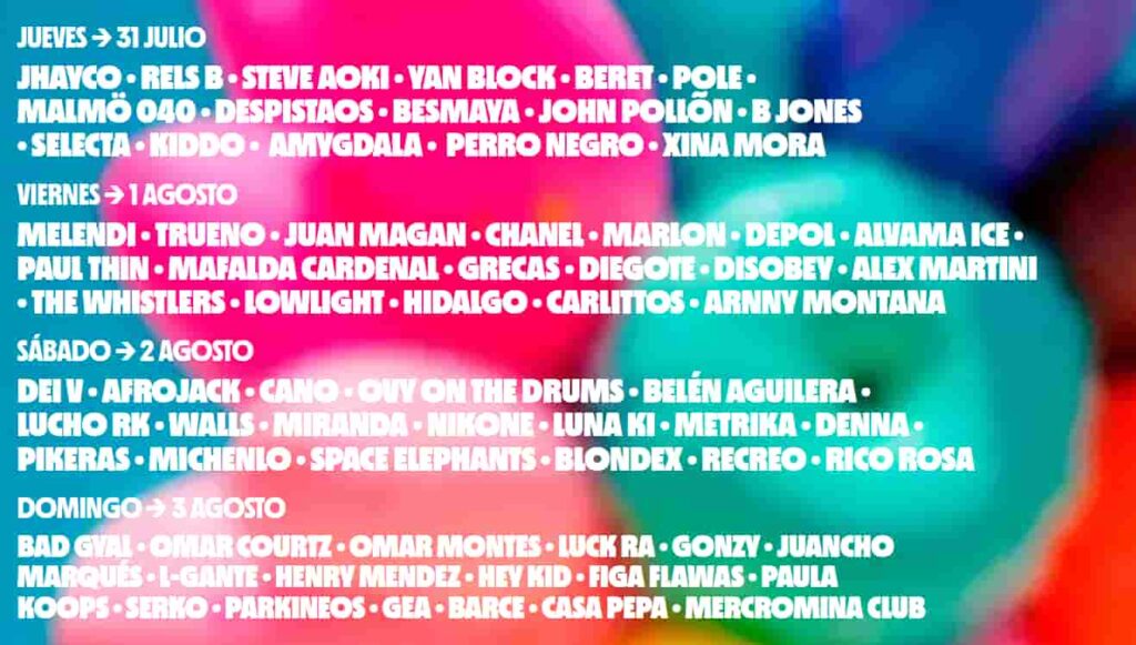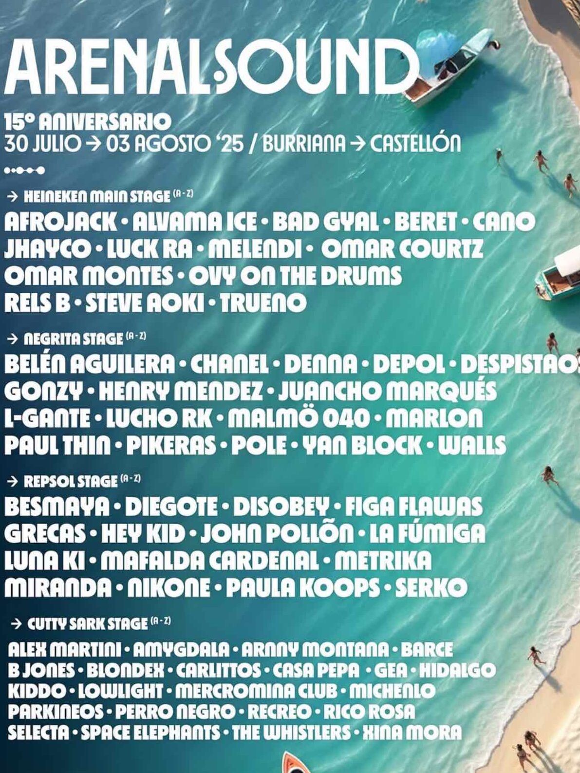 El festival Arenal Sound empieza el jueves 31 de agosto y arranca con nombres como Steve Aoki, Rels B, Jhayco, Beret, Pole y muchos más, cubriendo desde el estilo electrónico hasta el urbano. El viernes 1 destacan Melendi, Trueno, Juan Magán y Chanel junto a otros artistas. El sábado 2 viene fuerte con cantantes como Dei V, Afrojack, Cano, Ovy On The Drums entre muchos más. Por último, el domingo 3 estarán Bad Gyal, Omar Courtz, Omar Montes, Luck Ra para dar un cierre especial.