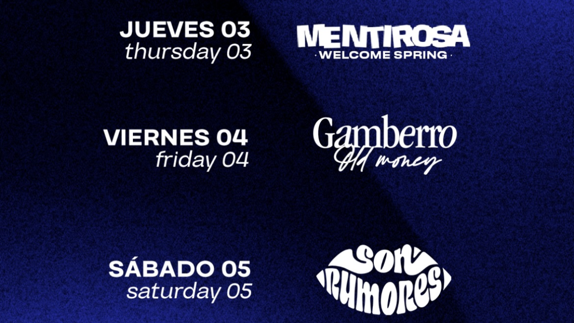 Cómo puedes ver en el flyer que enseñamos, para el jueves el evento que se anuncia es llamado como «mentirosa, welcome spring». Para el viernes, se llama «gamberro, old money». Y por último, para el sábado encontramos el llamado «son rumores».
