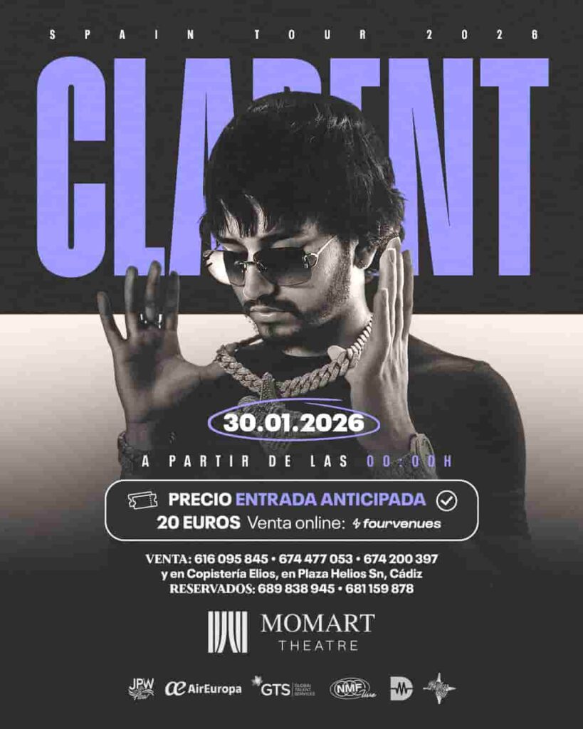 El artista urbano Clarent visitará Cádiz como parte de su Spain Tour 2026, con un concierto especial que se celebrará el viernes 30 de enero de 2026 en la Sala Momart Theatre. El show empezará a partir de la medianoche (00:00 h) y promete una noche intensa de música urbana, ritmos urbanos y la energía característica del artista puertorriqueño.