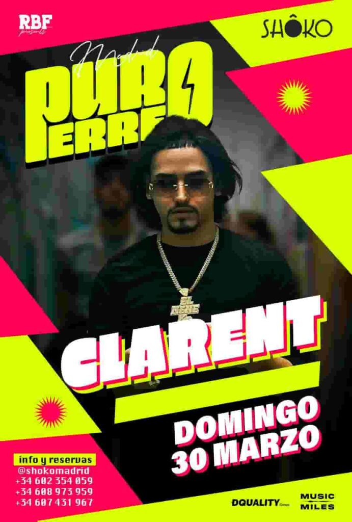El domingo 13 de julio de 2025, Clarent encabezó la noche “Puro Perreo” en la emblemática sala Shôko Madrid. El evento abrió sus puertas por la tarde/noche, y las entradas se adquirieron mediante la ticketera oficial de la sala, con precios variables según zona y anticipación.