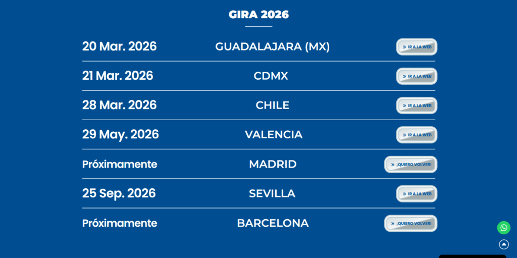 Los precios varían según el país, la ciudad y el recinto, por lo que conviene revisar cada evento para ver disponibilidad y tipos de entrada. En México y Chile, la demanda suele ser altísima, agotándose las fases iniciales en pocos días. En España, ciudades como Valencia, Madrid o Barcelona acostumbran a llenar recintos grandes, así que es clave no dejar la compra para el último momento.