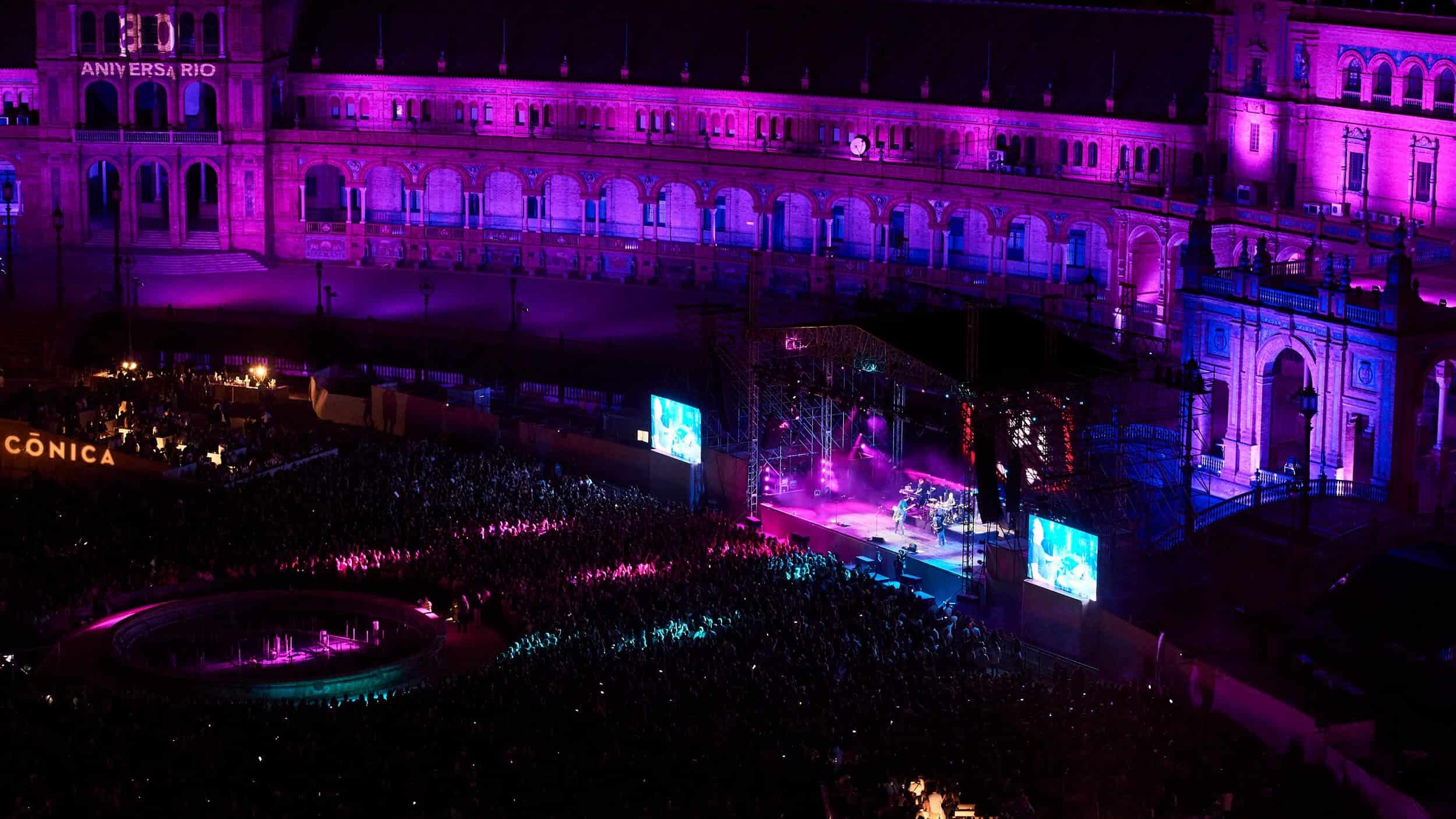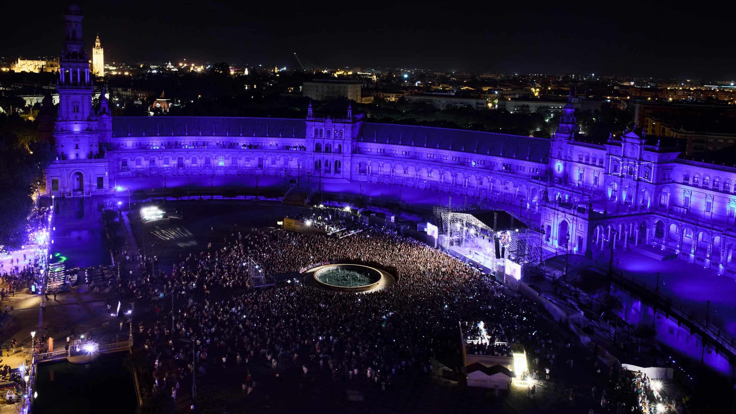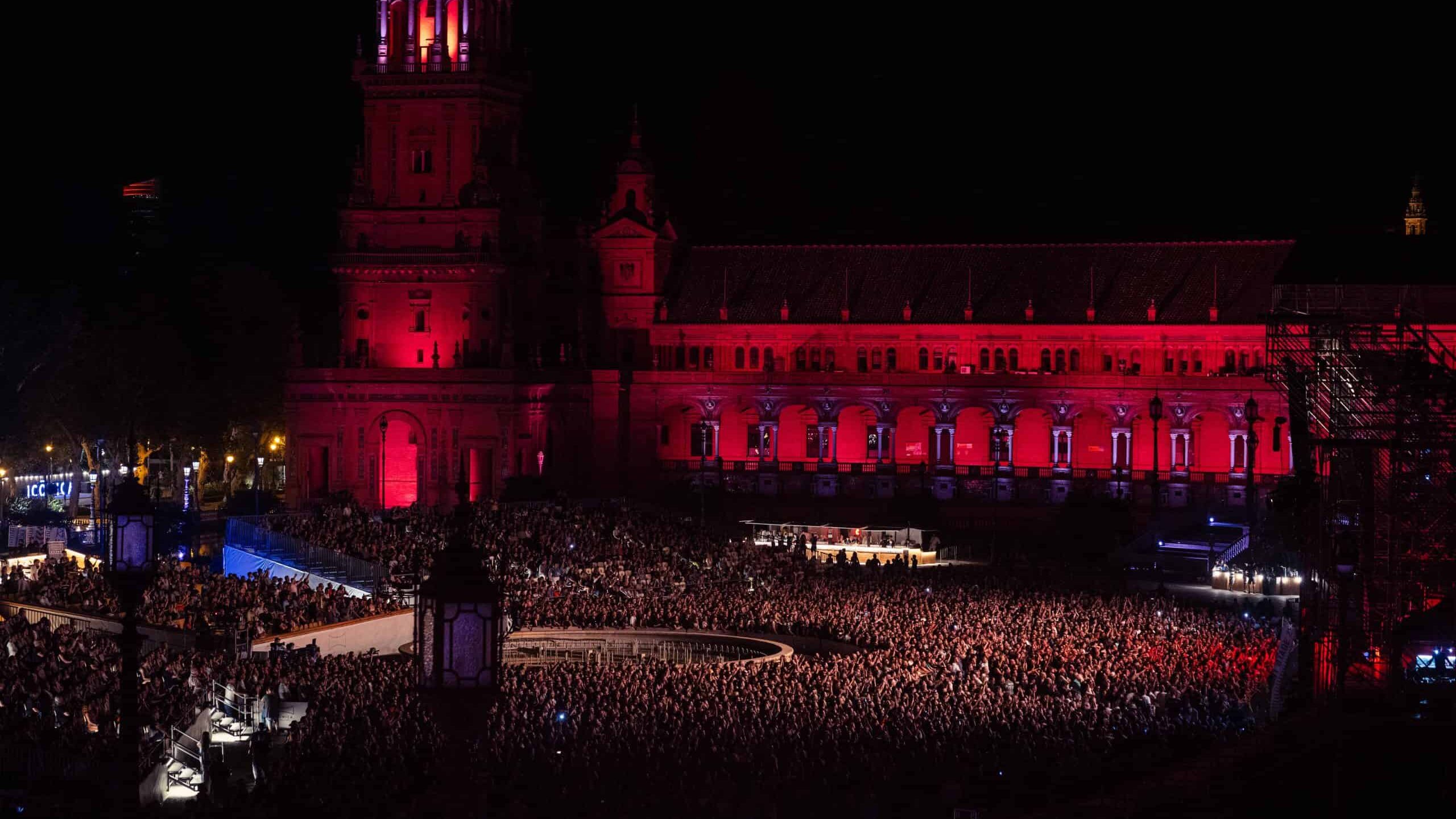 El festival se celebra en la Plaza de España de Sevilla, uno de los espacios monumentales más impresionantes de Europa. Su arquitectura, iluminación nocturna y amplitud crean una atmósfera mágica que eleva cada concierto a otro nivel.