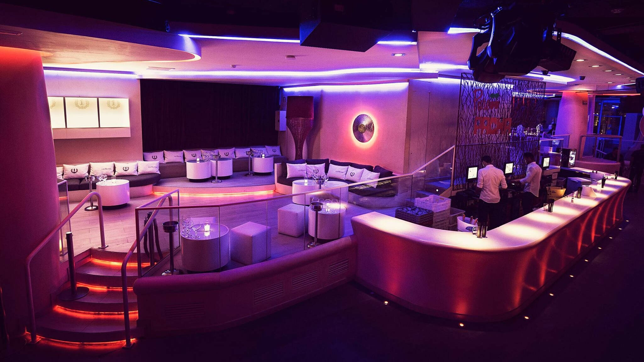 La decoración del club destaca por sus tonos blancos y rojos, sofás cómodos y luces envolventes , creando una atmósfera de lujo y diversión. El público que asiste es internacional, selecto y con ganas de vivir una experiencia premium en Barcelona .